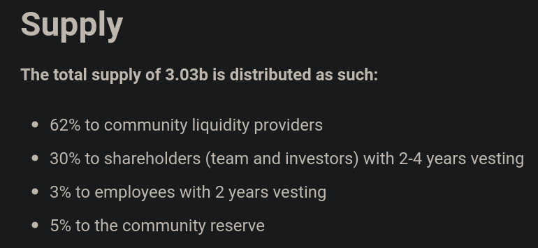 Tokenomics are sometimes the most important consideration to have when investing in a specific cryptocurrency or token. These describe how the token supply will be or currently is distributed, how much the liquidity providers, users and the community, the investors and developers will get, how long it'll take for the token supply to be fully diluted, among other things.