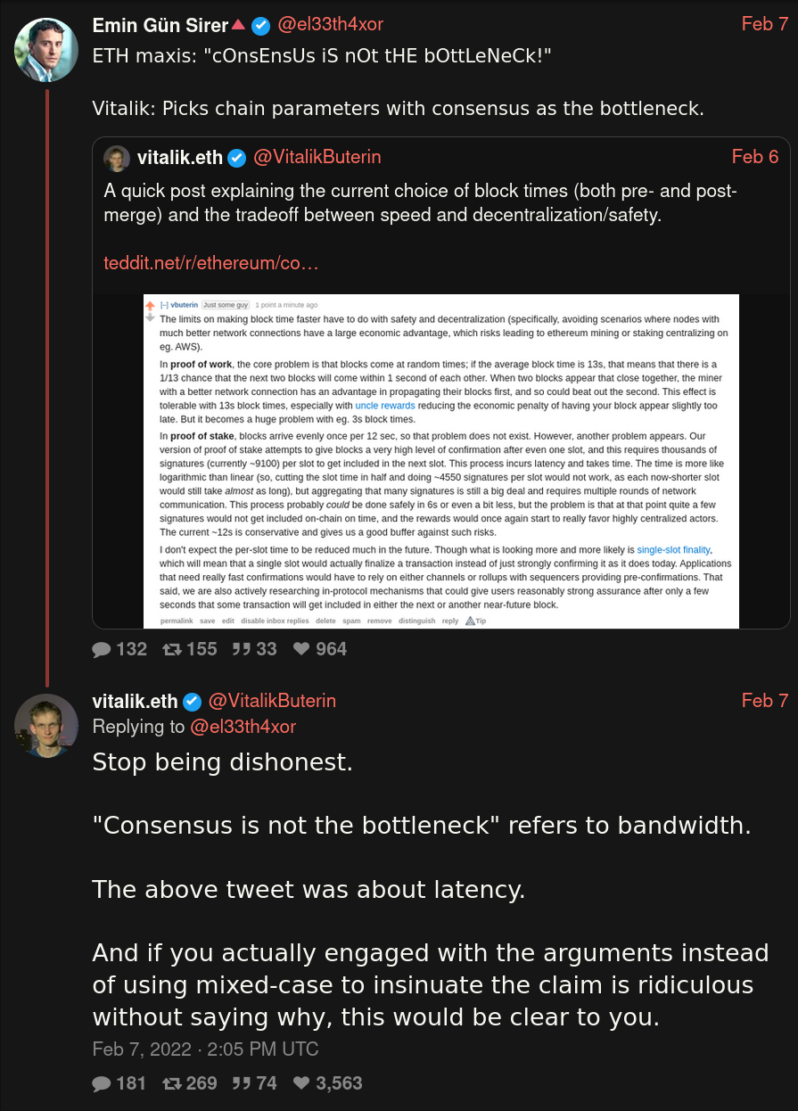 - This twitter thread by ChainLinkGod explains in great detail why these chains tout themselves as the ultimate fix to high transaction fees on Ethereum but their claims are at best dishonest like the tweet Vitalik calls out in the image above or at worst a quasi-scam like in the case of Pulsechain (yuck).