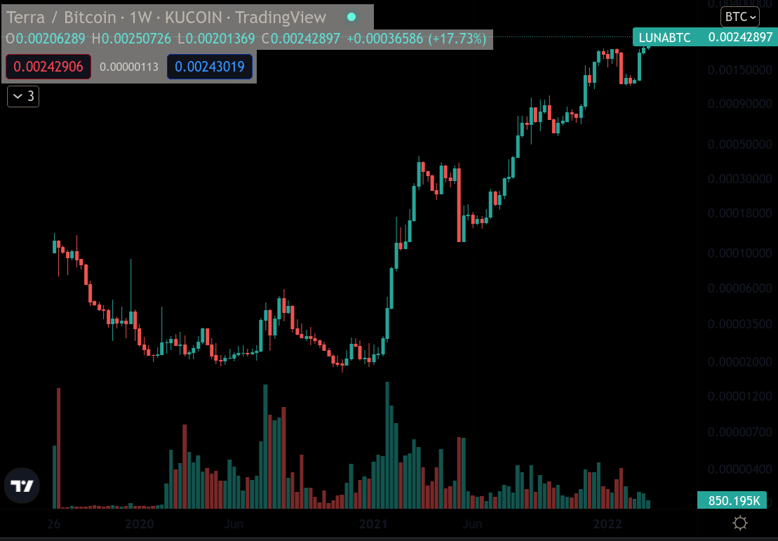 - LUNA/BTC: Holding LUNA (Terra's native token) has also been an absolutely spectacular investment as opposed to holding BTC or ETH. The Terra blockchain uses UST as its native token, a USD-pegged algorithmic stablecoin which is the main driver of growth of the ecosystem through a protocol called Anchor, which at the time of writing pays a consistent 20% APR on UST deposits. UST is backed by a basket of assets, in particular LUNA and a small portion of ETH and their staking rewards, however, the rewards backing UST are not of 20%, instead, the rewards are provided by a reserve of UST provided by investors. Additionally, not all the UST is fully collateralized. The growth of the ecosystem is great, but it may be unsustainable. This twitter thread by AlgodTrading and articles like this one from cryptobriefing.com go into more detail about potential risks and sustainability of the UST stablecoin. So then why is LUNA performing so well? When will investors take profits? are these 'ponzinomics' sustainable? No matter what, I still think LUNA's performance may continue for longer, but due to my personal risk tolerance, I don't usually get into projects whose sustainability I'm not 100% confident in.