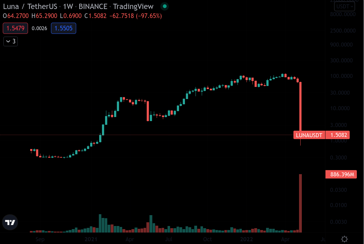 Update 2022-11-05: as expected, the LUNA/UST system has completely collapsed during May 2022's market crash. The price of LUNA was trading at around 80 USD on 2022-05-05, and it is now trading around 1 USD per LUNA. The crash occurred as follows: