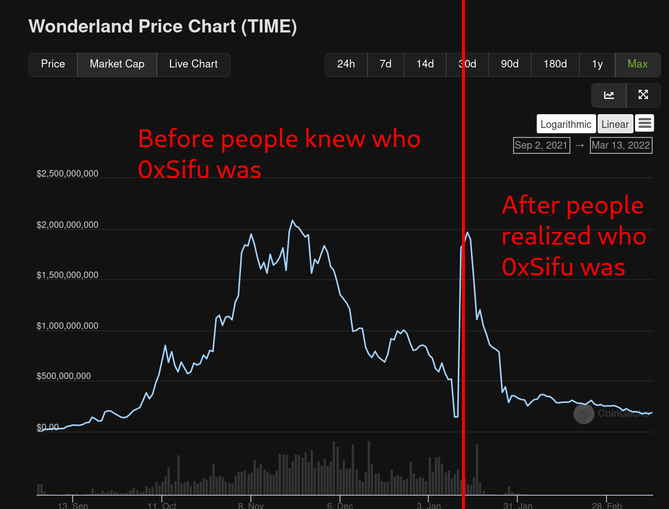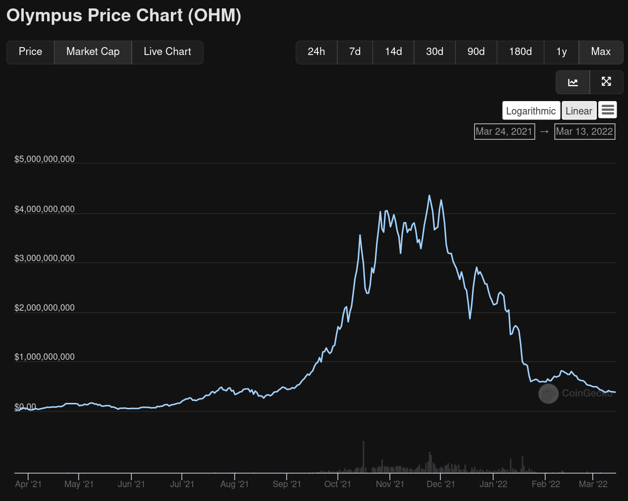 - A project called Olyseum, backed by large football celebrities like Andrés Iniesta had an investor token unlock event on March 31st 2021. The investor(s) whose portion came out of its vesting period decided to sell their stake causing the price to plummet from 0.82 USD to 0.07 USD, an over 92% drop in price over a span of under 1 hour. This caused massive panic among early community investors who expected the price to go up because they were 'early' right? The token now trades for 0.003 USD. This is not an Alt-L1 project but it's an illustrative example of what a large investor selling a significant portion of their stake in a short period of time can do to the price of an asset given how illiquid some market pairs can be. Here's an image of what happened to it: