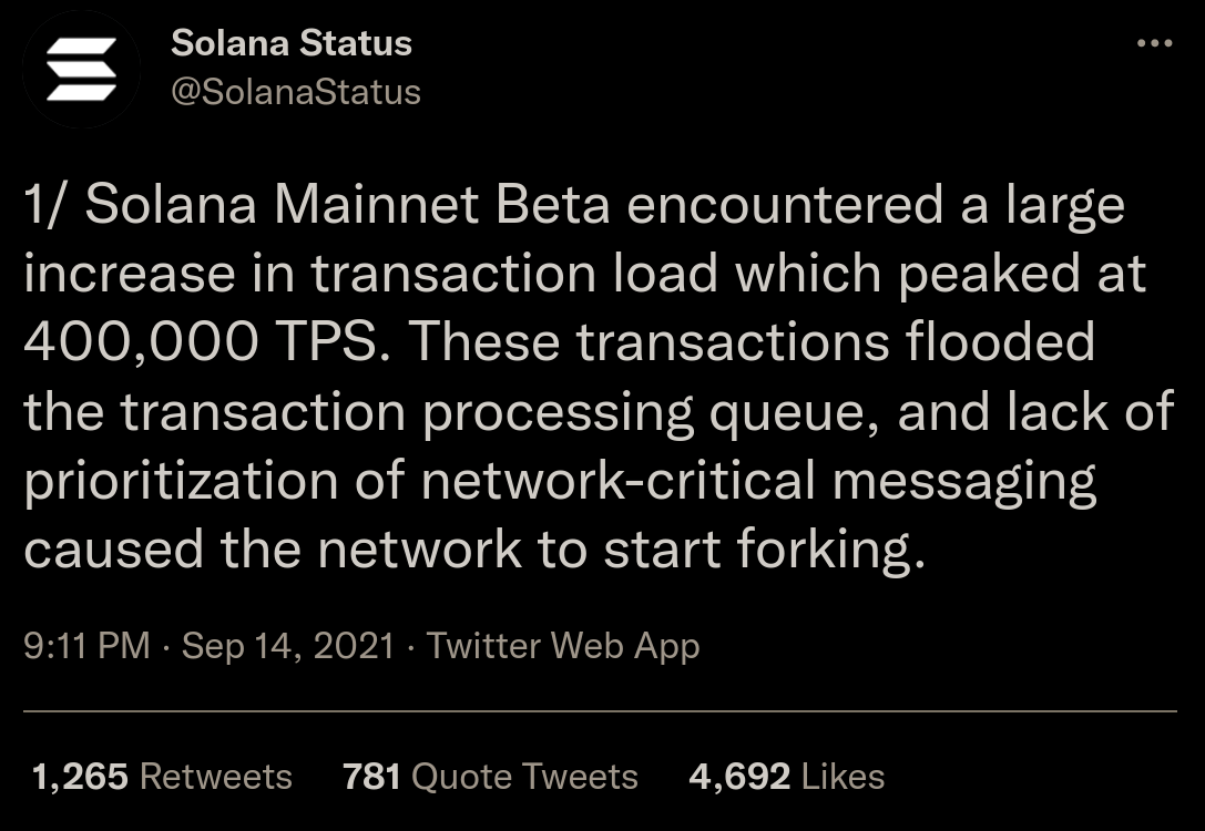 - Solana (for example) already has had several incidents causing extensive downtime where users are trapped without being able to move their money or execute any trades for extended periods of time. Either caused by a validator client bug, by excessive spam on the blockchain or any other reason. Downtime is a big risk to users.
