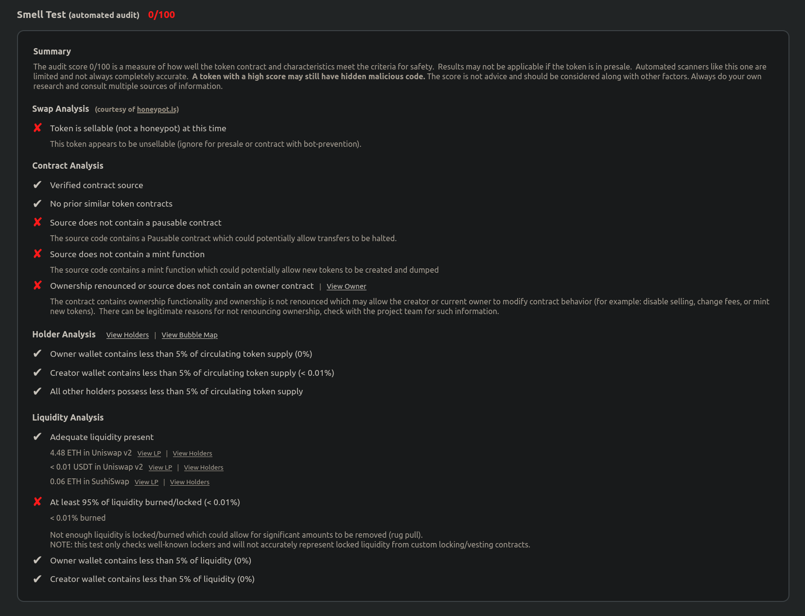 Is the token source code identical to that of a previous scam? Is the token vulnerable to any previously discovered vulnerability that any past project has suffered?