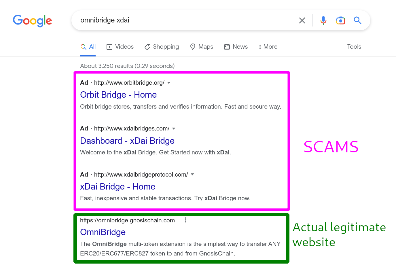 There's plenty of examples for this, but I'd personally like to focus on that of search engines, which we use every day to query and find information and websites when we need them. In particular, you should never expect companies like Google or Meta to perform any sort of meaningful due diligence when it comes to who their advertising clients are. Google, Meta or any large corporation will gladly take money from scammers unknowingly (or knowingly) just to make a profit in order to show you advertisements. Ads on Google are a particularly popular tool for scammers to publicize these modified application sites because ads are pushed to the top of results. All a scammer has to do is build the site, modify the transaction payloads and buy ads on google, and now whenever you search for a specific app, the scammer's site will show up before the actual legitimate website: