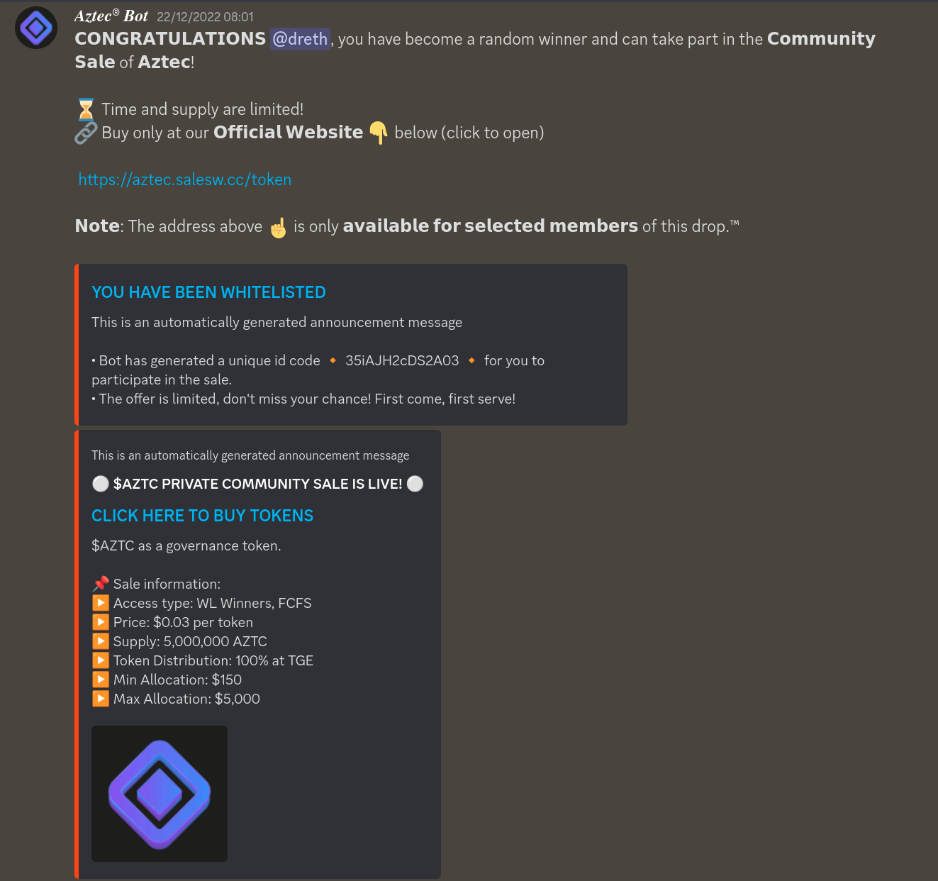 Scam: The project (Aztec in this case but could be any) is NOT actually running a presale for any tokens. You cannot buy any real tokens for the project because the project doesn't even have a token, nothing has been announced about it and much less a presale sent to random users in the server. The user sending it is NOT a bot despite the word 'bot' being in their username, it's just something someone created to send this to randoms. When you go on the site you'll see some pretty generic interface that allows you to connect your wallet after giving up some information which you should NOT ever give and then you'll be sent some fake tokens. The tokens are worthless and whatever you give up to buy them is effectively gone, stolen from you by some internet stranger. Any sort of presale of this sort will NOT be sent to your personal messages, this is not how that works. Additionally, Aztec is a large project that has raised millions of dollars to fund their operations and development, they don't need to do a presale to raise money.