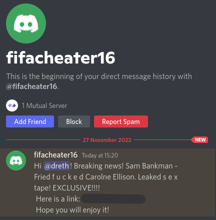 Message: A message telling me there's a way to look at a viral supposed sex tape of Caroline Ellison and Sam Bankman-Fried, two notorious criminals that orchestrated the Alameda + FTX fraud and former romantic partners. A large scale fraud that stole money from investors, clients, celebrities and could be the largest ever scam in the history of cryptocurrency. The sex tape is theorized to exist, but there's been zero confirmation of it and it has never actually surfaced.