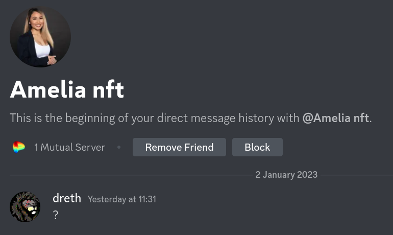 Overall, I am 100% confident this friend request is from either a scammer (real human) or a bot intending to spread scam links. Friend requests are more often performed by humans than bots, as it's probably a more 'aggressive' activity than a message request on discord in terms of how many captchas it may prompt the attacker. I can also assume this because I receive significantly more message requests than friend requests.