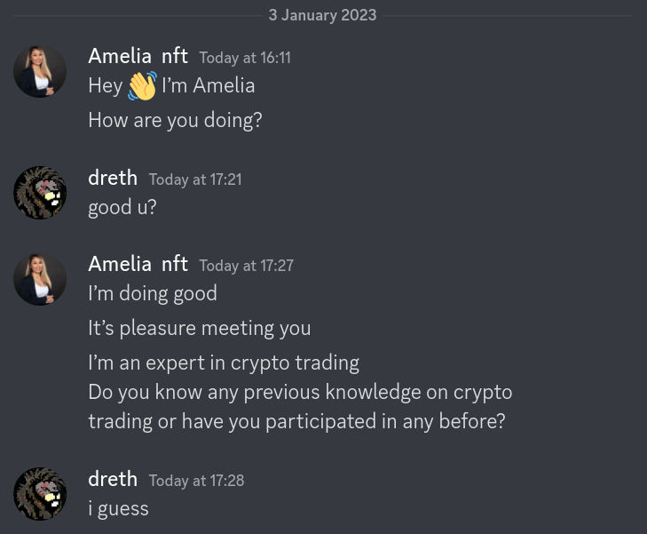 Message: just a greeting from someone that looks to be supposedly a young woman asking me about interests in cryptocurrency investments. Writing rather long messages despite my very short, clearly uninterested replies.
