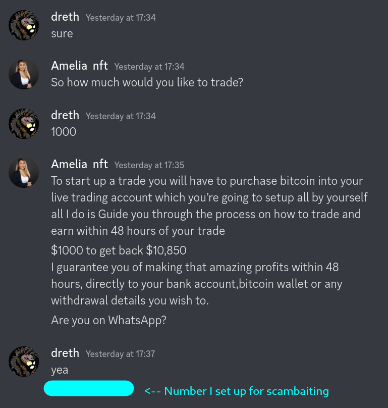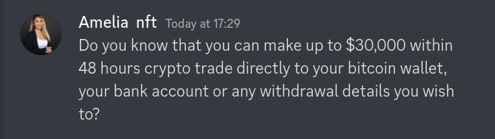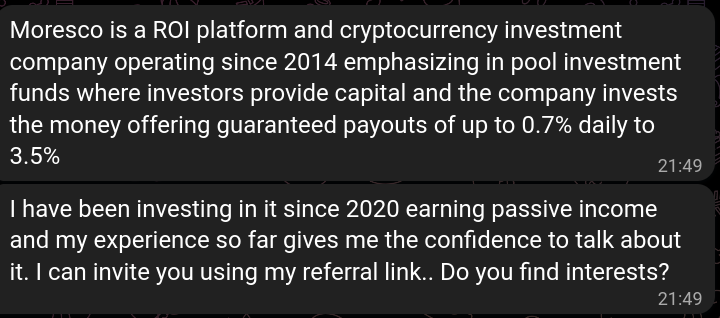 In either case, this is essentially just an offer to supposedly invest in some sort of high yield investment platform where they're going to multiply my money by basically taking it, blocking me, deleting the conversation for both of us and disappearing. One of the great perks of telegram is that you can delete conversations fully for both parties, something that scammers love to do either after a successful scam or a failed one. Here's their message: