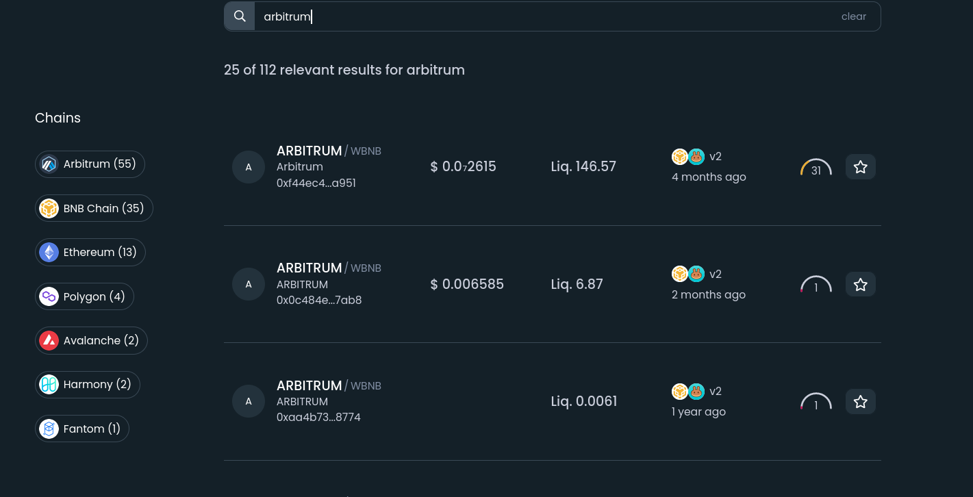 Sometimes scam tokens are used to create trading pairs of tokens that just haven't even been released yet. For example, at the time of writing this section (16th January, 2023), the Arbitrum optimistic rollup on Ethereum hasn't released an official token. Since Arbitrum doesn't have an official token but lots of people expect it to have one at some point, opportunistic scammers often create trading pairs with fake ARBI or ARBITRUM tokens in order to fool real traders into believing the token has already been deployed and to show that they're buying the real deal. People may want to buy these tokens because they might have a big run up from the moment of release, as there's lots of hype surrounding token deployments like this one. It's almost certain that every single trading pair created with the name ARBI or ARBITRUM at the moment is a scam pair: