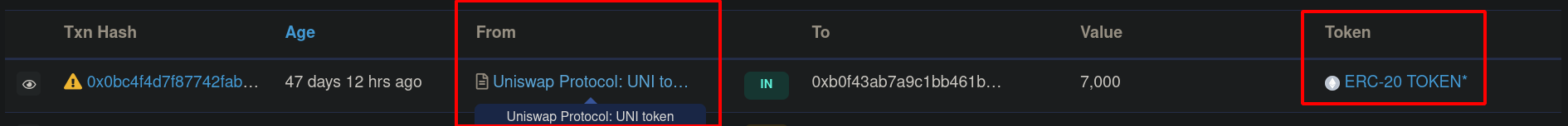 In this case, the sender looks to be the UNI token contract of the Uniswap Protocol, but this is NOT the case, the sender has been spoofed.