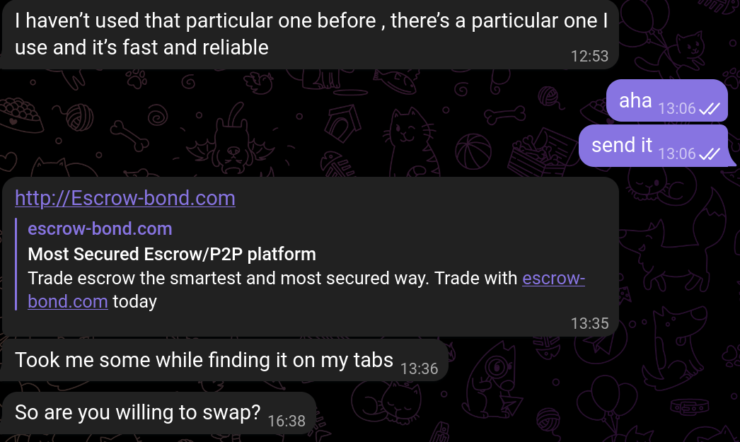Scam: This person refuses to use a VPN, refuses to use a decentralized exchange and insists on doing a peer 2 peer trade. The purpose here is to basically leave you either hanging with worthless tokens after a 'fair trade' through a 'fair platform' or convince you to send first so they run away with your assets. Another thing the person could do, which is even more convincing and what they actually ended up doing is send me some sketchy website that should function as a p2p platform, but obviously is designed for you to either sign malicious transactions or to just leave you hanging with worthless tokens: