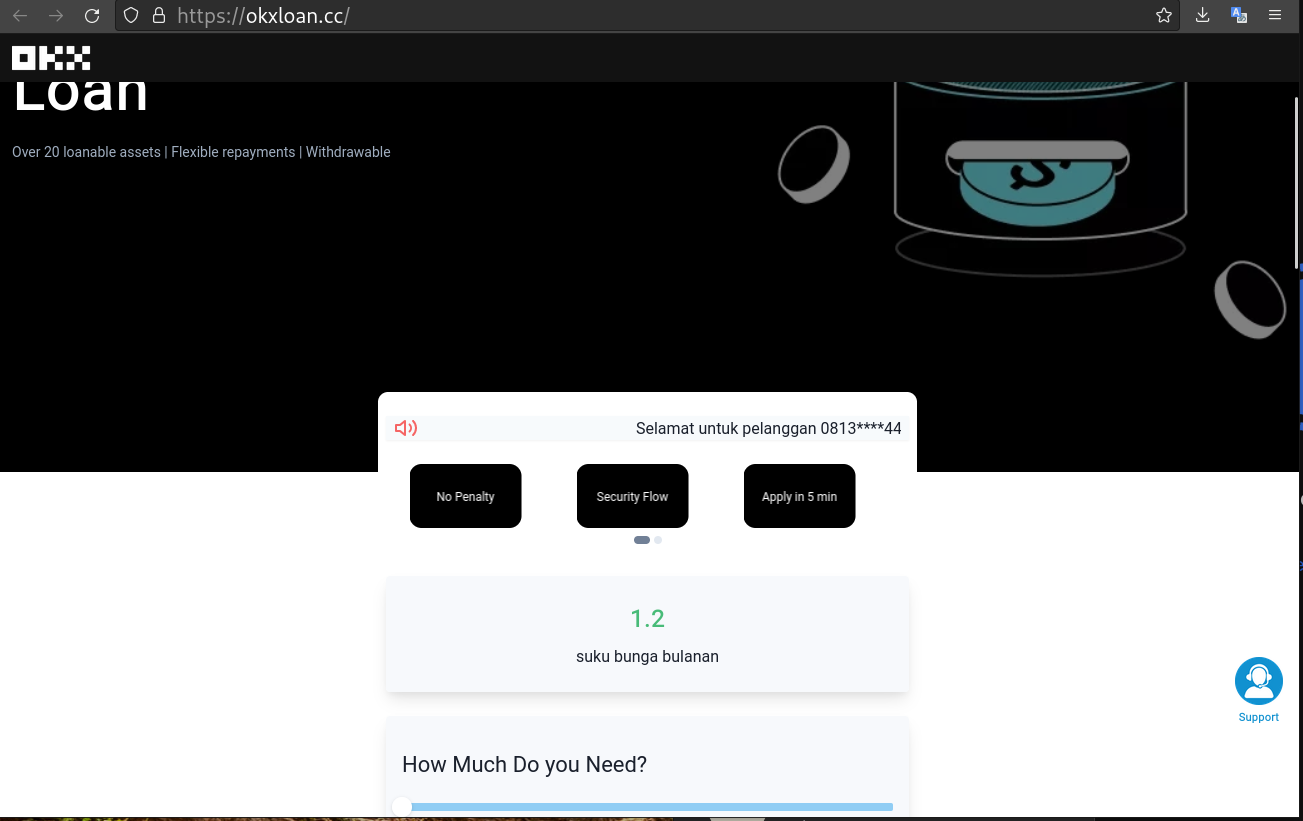 Scam: The link directs you to a site where you can supposedly take loans of very large sums of money denominated in USDT (a USD-pegged stablecoin) as well as a notification to contact a person if you need money urgently. Obviously this is a scam pretending to be some sort of subsidiary of OKX. The site is all in Malay and English (having multiple languages together is a huge red flag):