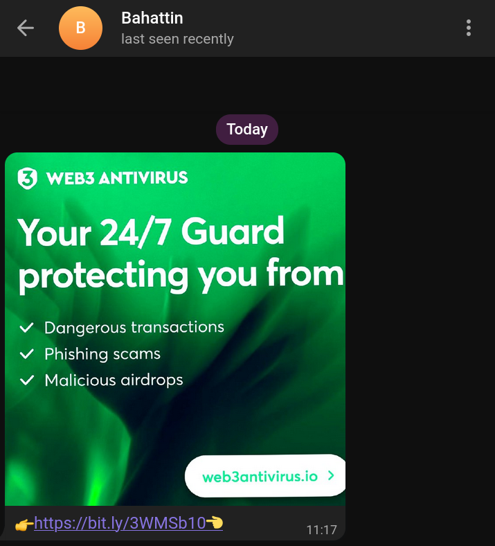 Message: an image recommending a 'web3 antivirus' with a bitly link (a commonly used URL shortener)