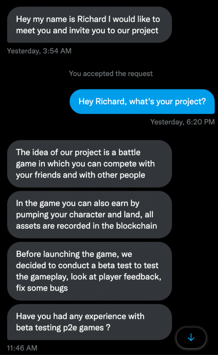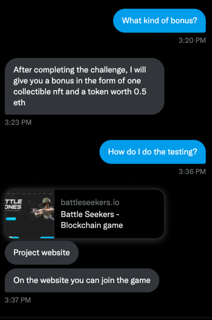 Scam: The message is already rather suspicious in itself, as no one will randomly recommend you to try out their game. Then the scammer tries to convince us by saying that there will be a reward of an NFT worth 0.5 ETH at the end of the beta testing process: