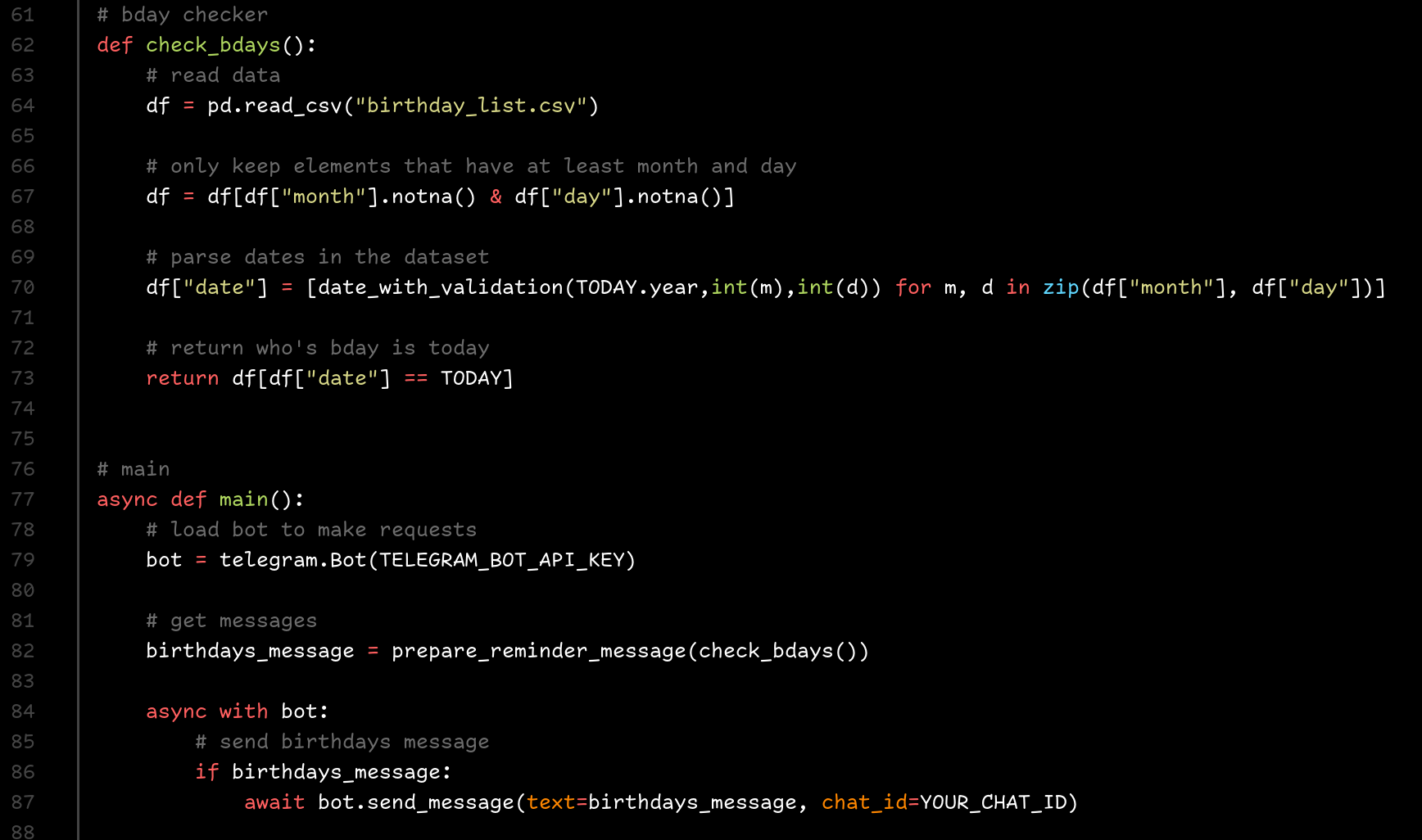 - A place to periodically run useful scripts: I actually didn't replace a service for this, but it does serve this purpose. In particular, I have at the moment two useful scripts I run every day in the server, one of them is a birthday reminder script I made that sends me reminders for birthdays of people I care about to my telegram account through a telegram bot. Another one is a script I made that reboots my home router every night by going through its web interface in a headless browser.