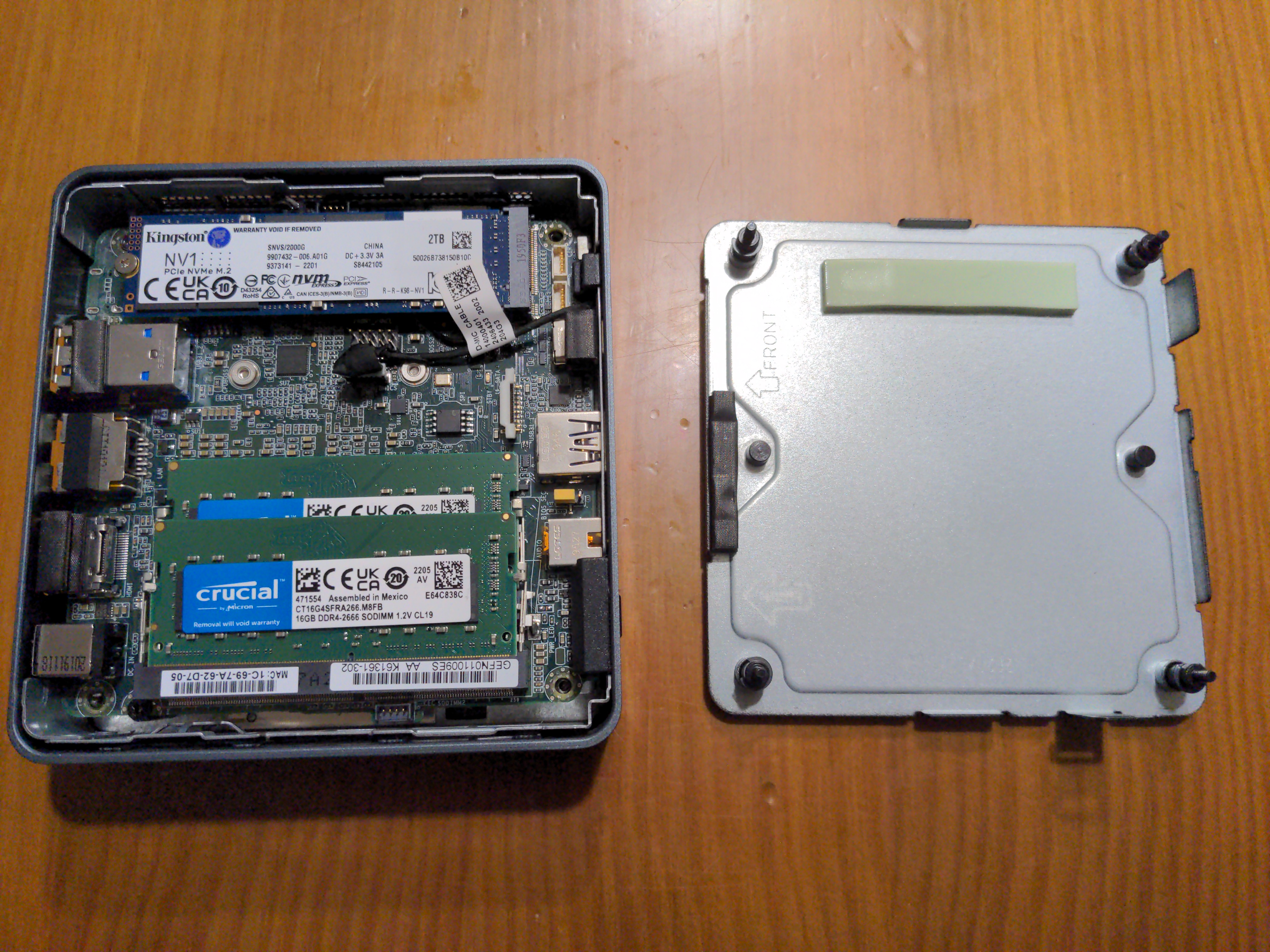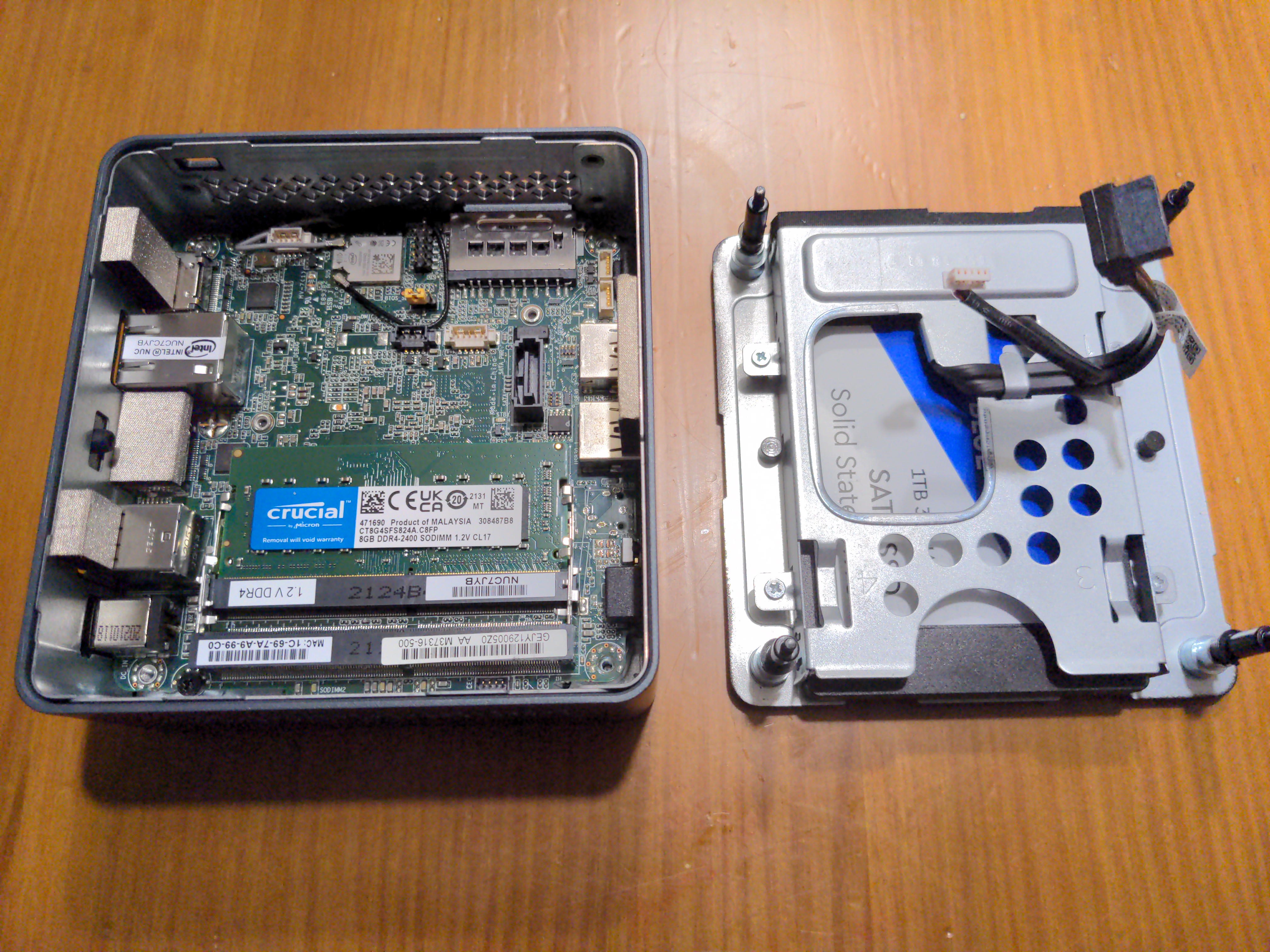 Initially, I got a barebones Intel NUC NUC7CJYHN with a 2 GHz intel Celeron J4005 off of Amazon Spain and populated it with the following hardware: